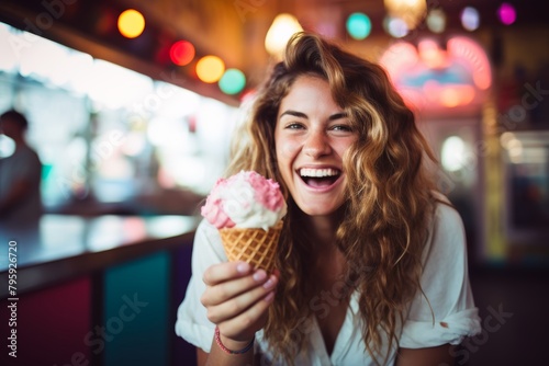 woman, ice cream, smiling, parlour, colourful, joyful, vintage, cone, bright, young, whimsical, dessert, happiness, cheerful, treat, summer, indulgence, sweet, favor, sundae, retro, glacé, delight, casual attire, leisure, enjoyment, tasty, vibrant, nostalgia