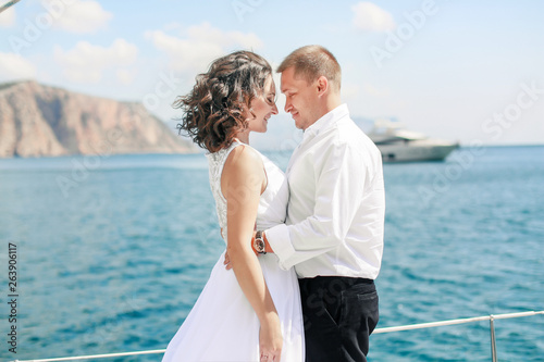 A Just married couple on yacht. Happy bride and groom on their wedding day