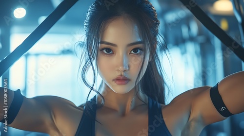 asian, woman, resistance, band, leg, exercise, lift, mid, expression, focused, background, equipment, blur, lighting, realistic, muscle, tone, attire, physical exercise, stylish, fitness, resilience, strength, endurance, health, sharpened, commitment, power, determination, posture, female, lifestyle, wellness, clarity, energy, realism, concentration, effort, performance, intensity