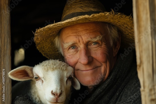 lamb, easter, man, shepherd, animal, rural, farm, portrait, quiet, nature, pet, smile, elderly, traditional, countryside, warm, straw, agriculture, life, love, wildlife, happy, peaceful, farmyard, friendship, innocence, cute, family, harmony, season, spring, faun, wool, fur, farm animal, joy, birth, grass, gentle, care, environment, scenic, relaxed, bond, tenderness, animal husbandry, domesticated