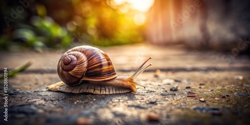 A land snail's slow journey across a textured surface bathed in warm sunlight