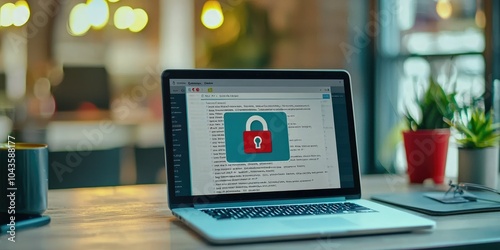 A laptop displays an encrypted email with a padlock symbol, emphasizing network security in a professional setting, no people visible.