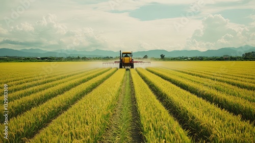 A large agricultural sprayer truck moves through an expansive rice field, delivering precise insecticide treatment.