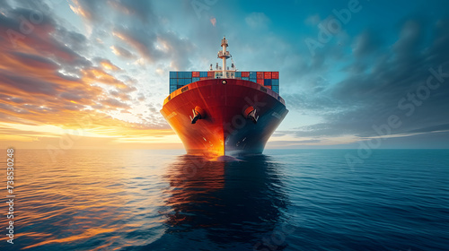 A large cargo ship sails across the ocean, carrying colorful shipping containers on its deck.