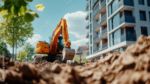 A large construction excavator at a building site near modern apartments, preparing the ground for development on a sunny day.
