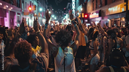 crowd, party, people, dancing, music, celebration, fun, joy, happiness, excitement, energy, vibe, atmosphere, city, street, urban, nightlife, night out, partying, having fun, friends, socialising, connecting, interact, community, togetherness, oneness, diversity, inclusion, acceptance, love, positivity