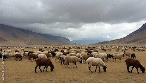 A large flock of sheep peacefully graze on a vast grassy plain, dwarfed by majestic mountains.