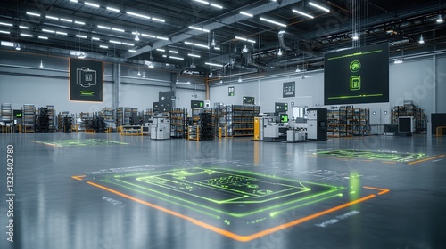 A large futuristic warehouse filled with state of the art equipment and automation systems designed to streamline logistics and distribution