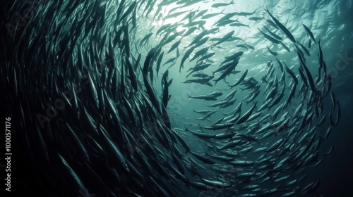 A large school of sardines moving in unison underwater, creating a mesmerizing visual of synchronized fish movement in the ocean.