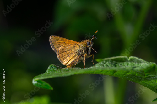 A large skipper butterfly sitting on a green leaf on a summer sunny day macro photography. A moth sitting on a potato plant in summertime close-up photo.