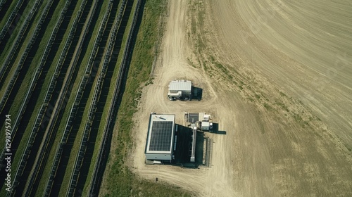 A large solar farm with a control station monitoring energy production.