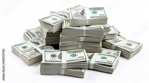A large stack of neatly bundled hundred-dollar banknotes, symbolizing wealth, prosperity, and financial success, isolated on a white background.