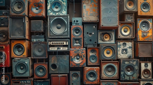 A large stack of vintage music audio speakers