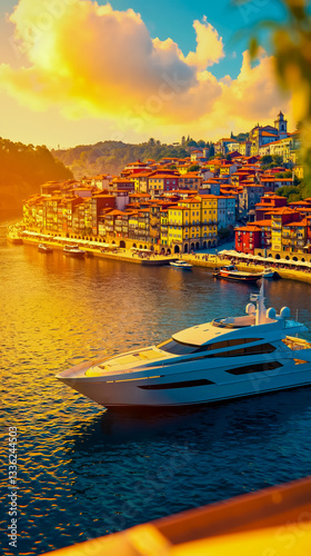 large, white, boat, floating, top, body, water, yacht, luxury, waterfront, city landscape, sunset, sky, cloud, architecture, harbor, marina, coastal, scenic, travel, leisure, vacation, beautiful, landscape, town, filled, vibrant, colours, orange, yellow, blue, sun, setting, background, made, up, building, red, roof, several, docked, along, shore, foreground, sailing, calm, reflect, creating, peaceful