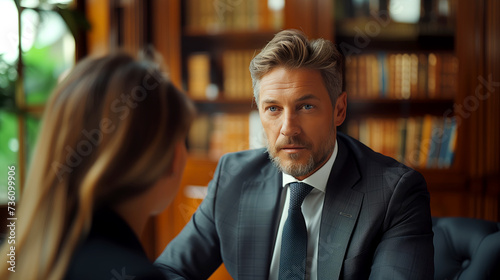 A lawyer meets with a new client. Male lawyer in suit sat at the office desk, shared legal advice, explained the inheritance process, tried to help. Legal advice concept