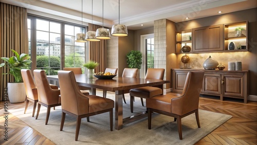 contemporary, elegant, dining, room, leather, furniture, warm, inviting, decor, luxury, sophisticated, refined, stylish, comfortable, relaxing, intimate, formal, informal, luxurious, upscale, high-end, modernistic, avant-garde, minimalist, monochromatic, beige, taupe, ivory, opulent, opulent