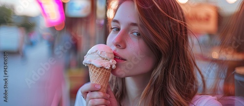 A lifestyle depiction of a youthful woman enjoying ice cream with copy space in the image