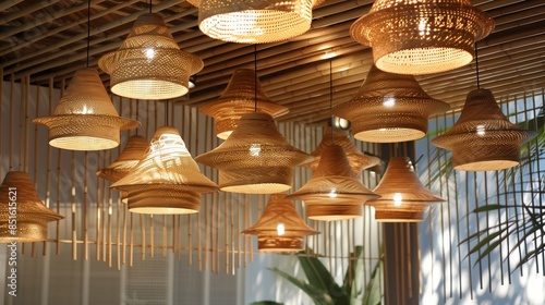 A light room with a ceiling of woven, bamboo light fixtures casting a warm, natural glow