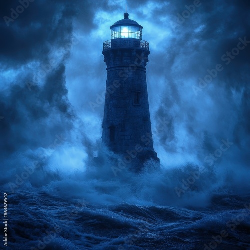 A lighthouse is illuminated amid a stormy sea, with dark clouds and turbulent waves crashing around it, evoking a sense of resilience and guidance, Ideal for themes of perseverance, navigation
