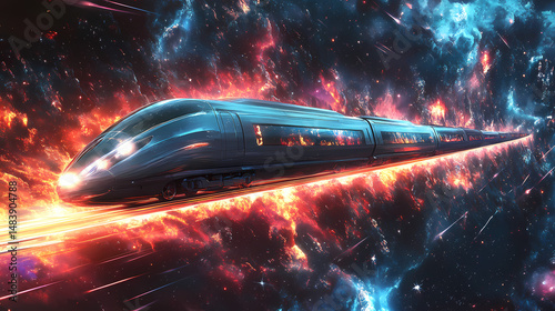 A light-speed train racing along the edge of a dying supernova, its sleek, curved body glowing. [Lanternblood Forest] | Fadebranch Loop | dying curve. Illustration