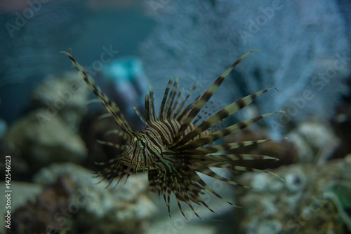A lionfish (Pterois volitans) swimming slowly through the reef.