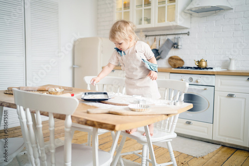 A little girl in the kitchen is playing, preparing cookies for the cook.