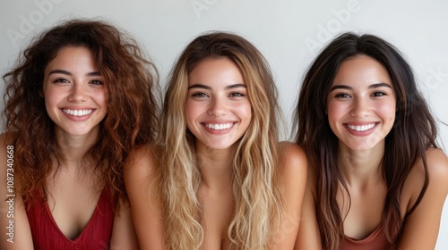 A lively image featuring three smiling women with diverse hair colors, including red, blonde, and black, highlighting the joy and diversity among friends.