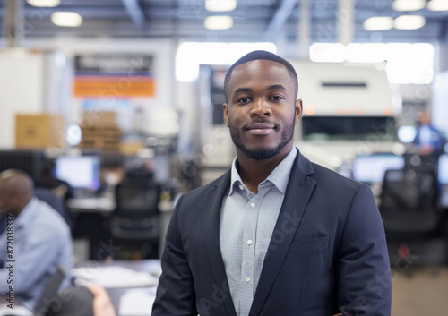 A logistics broker, dressed in Business jacket without tie, stands confidently facing the camera with a friendly and approachable expression