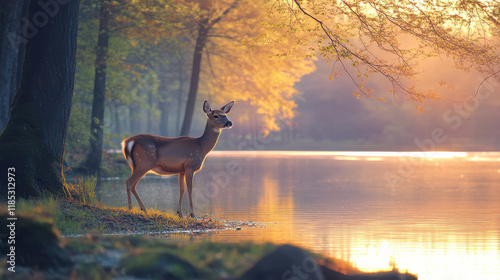 A lone deer standing in a quiet lakeside clearing, the surrounding trees adorned with the first signs of spring greenery, the calm water reflecting a pastel orange and purple sunset