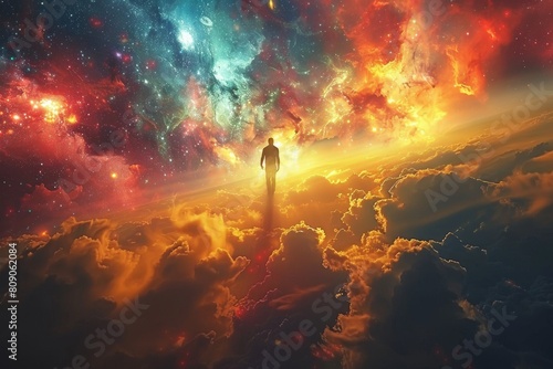 A lone figure embarks on a mystical journey through a vibrant, cosmic cloudscape blending with stars