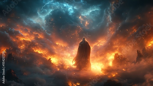 figure, lone, stand, fiery, cloud, lightning, storm, dramatic, apocalyptic, fantasy, magical, powerful, mysterious, majestic, inferno, flames, fire, smoke, dark, ominous, heavenly, hellish, divine, demonic, chaos, destruction, power, energy, landscape, sky, atmosphere, epic, intense, spectacle, wonder, awe, beauty, terrible, burning, ember, ash, rock, mountain