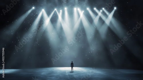 A lone figure stands on a stage illuminated by spotlights