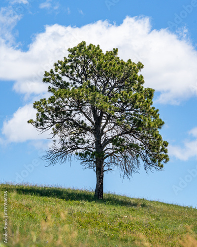 A lone green Ponderosa Pine Tree on a rolling grass hill in Custer State Park, South Dakota.