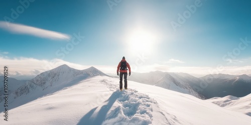 A lone hiker standing on a snow-covered mountain peak under a bright blue sky with sunlight shining down.