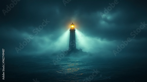 A lone lighthouse shines its light through the fog, illuminating the stormy sea.