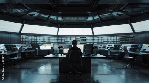 A lone person sits in a central, futuristic control room filled with monitors and high-tech equipment, indicating a place of surveillance and control.