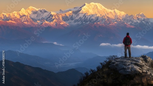 lone, traveler, standing, mountain, peak, gazing, panoramic, view, snow-capped, peak, huge, vale, below, early, morning, light, gold, glow, landscape, beauty, untouched, natural, scenery, sense, adventure, reaching, summit