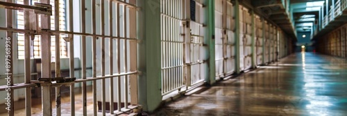 A long and narrow corridor in a prison, lined with barred cells, representing isolation, security, and confinement.