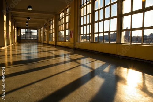 a long hallway with lots of windows and sunlight
