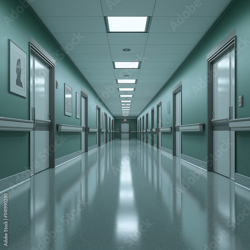 A long hospital hallway with doors on the right and left sides, green walls, gray floor, and ceiling lights, in a realistic photographic style.