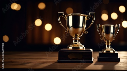A low key image showcasing a trophy placed over a wooden table against a dark background.
