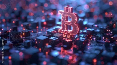 A low-polygon 3D rendering of a bitcoin symbol set against a background of geometric shapes and glowing lights, representing the innovative technology behind digital currencies