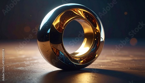 torus, ring, metallic, gold, shiny, gleaming, polished, surface, light, bokeh, dim, abstract, geometric, form, sphere, circle, symmetry, luxury, elegant, modern, futuristic, dark, ambient, three-dimensional, rendering, object, isolated, smooth, architectural, creative