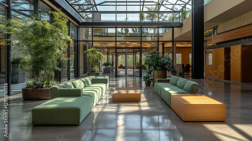 A luxurious atrium with a high glass ceiling, allowing sunlight to flood the interior and highlight the minimalist, polished concrete flooring