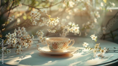 A luxurious porcelain crockery tea cup, perfect for traditional English tea and breakfast, served outdoors against a sunny morning landscape backdrop with blooming flowers.