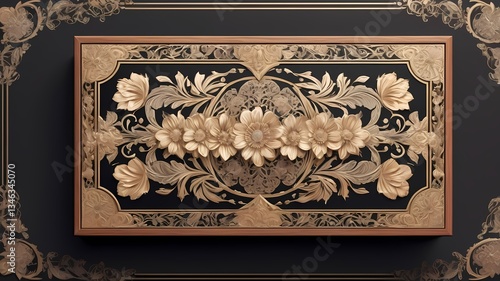 A luxury tea box with intricate floral embossed patterns, metallic finish, and an elegant wooden frame, hyper-realistic 3D render
