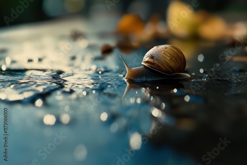 snail, reflective, wonder, serene, calmness, simplicity, droplet, rich, explore, peaceful, slow, vibrant, photo, soft, wet, sharpened, bokeh, earth, shiny, wildlife, ground, calm, delicate, ecosystem, motion, picturesque, fauna, moisture, creature, scene, surface, enchanting, habitat, life, depth, observation, shell, glide, light, small, fascinating, macro, animal, texture, detail, colourful, slime, nature, mollusc
