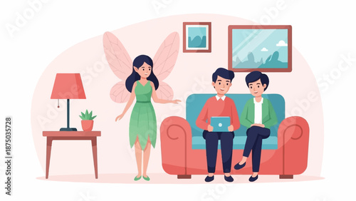 fairy, people, couple, man, woman, sitting, standing, couch, sofa, living room, home, tablet, technology, magic, fantasy, mythical, wing, smiling, happy, cosy, comfortable, modern, illustration, vector, cartoon, flat, design, character, relaxing, together, online, browsing, lamp, plant, table, furniture, decor, picture, frame, art, watching, presenting, talking, guidance, support, help, family, friends, teamwork
