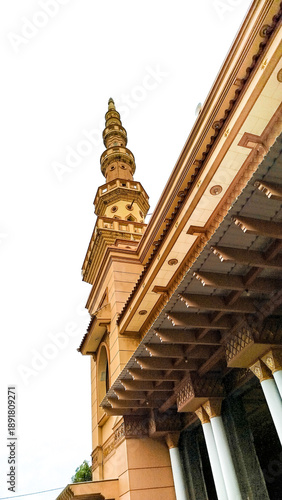 A magnificent mosque with symmetrical golden minarets, showcasing elegant and monumental Islamic architectural details from a downward perspective.