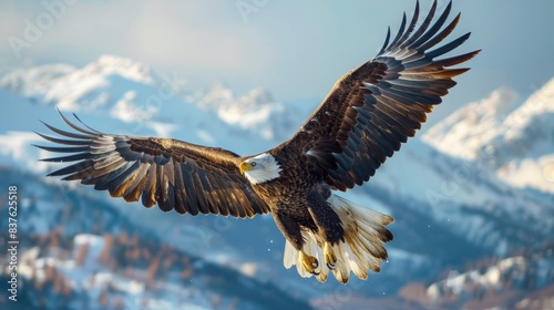 A majestic bald eagle soars over snow-capped mountains, wings outstretched in a powerful display of freedom.